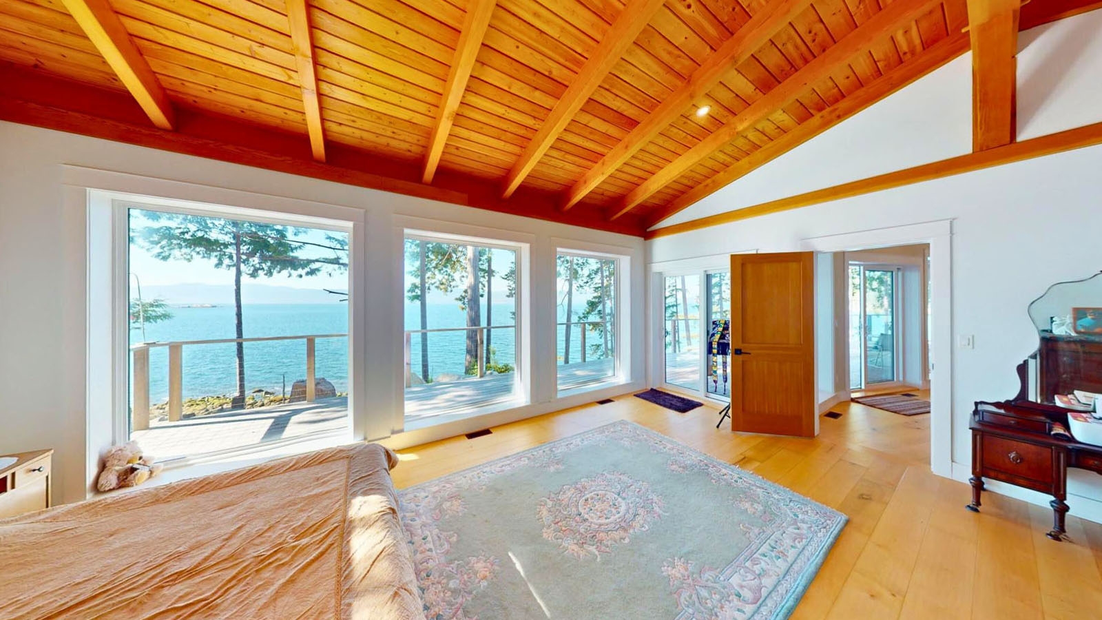 A 298 sq. ft. front covered patio and 865 sq. ft. exterior front deck provide ample space for outdoor living and taking in the serene seascapes. Additional features include an outdoor shower and direct access to the oceanfront, where a staircase leads to a fire pit and easy access for kayaking, swimming or casting a line from shore.