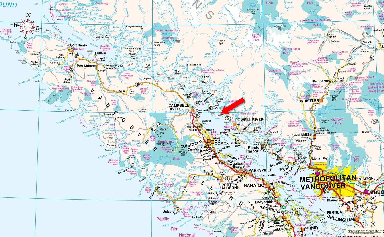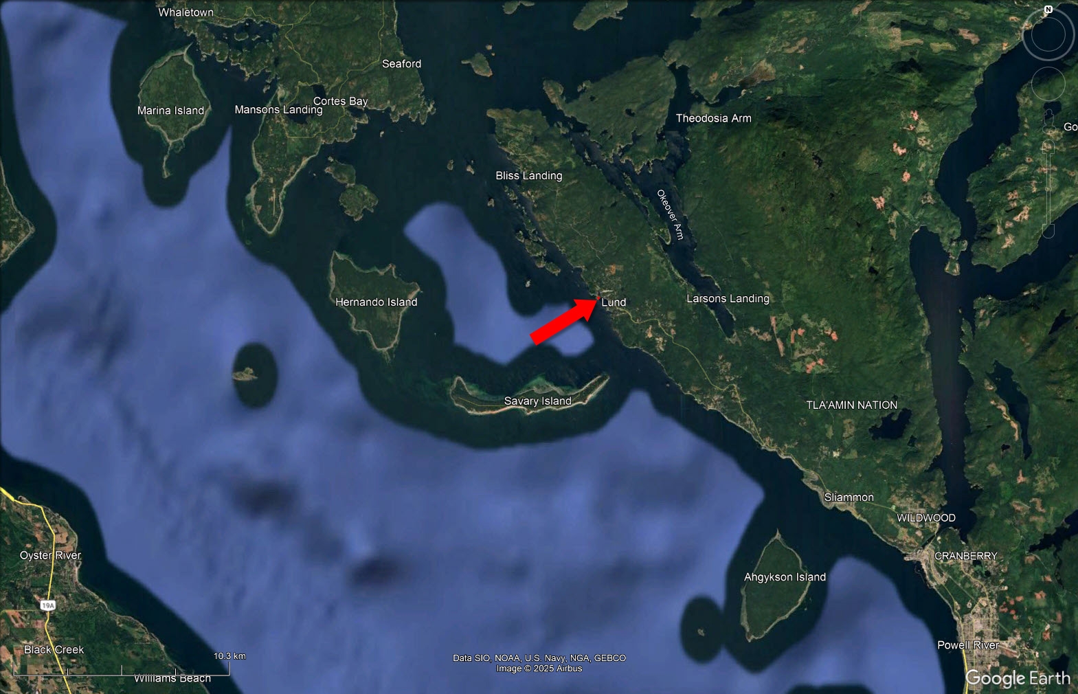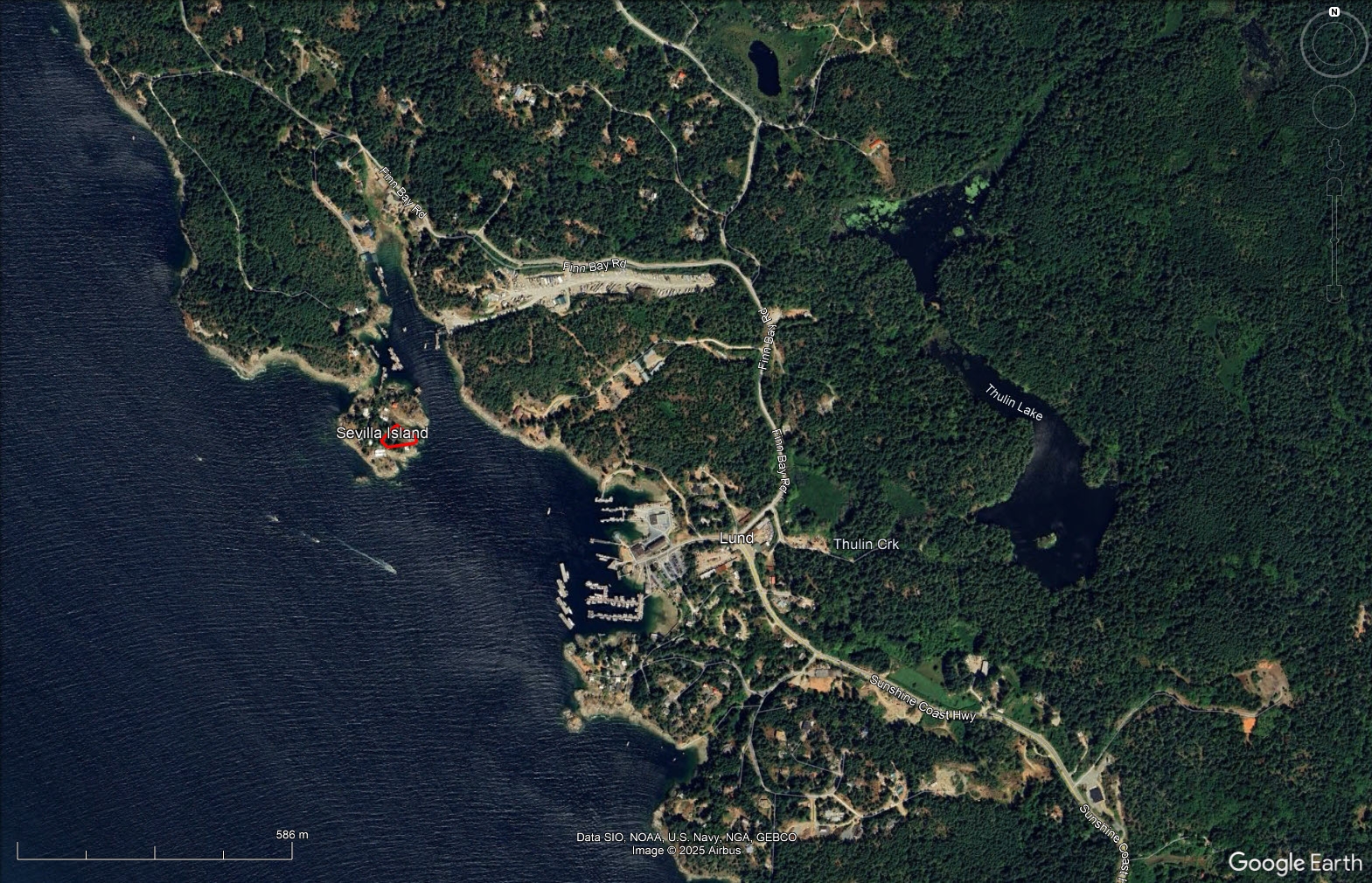 Sevilla Island is located within Lund Harbour near the City of Powell River on the coast of British Columbia, approximately 145 kilometres (90 miles) north of Vancouver.
