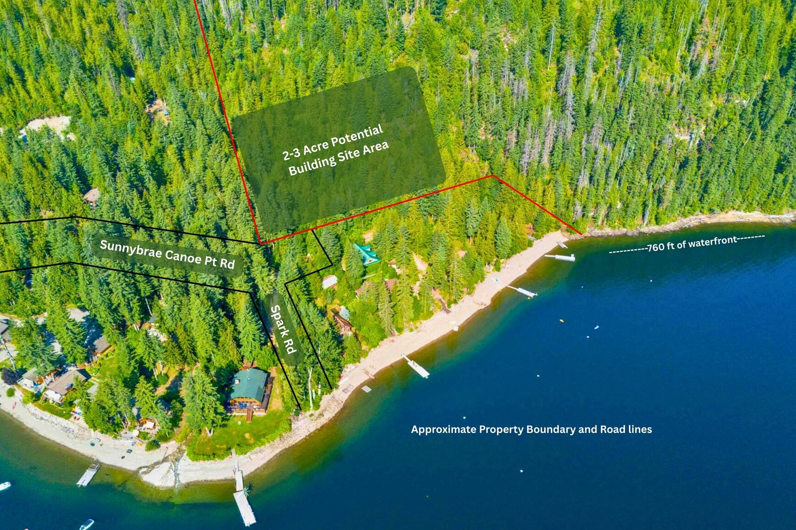 The property includes approximately 760 feet of Shuswap Lake frontage. The waterfront portion is accessed by boat and offers potential for a dock and cabana structure, subject to applicable approvals. Additional public lake access is available nearby via Spark Road.