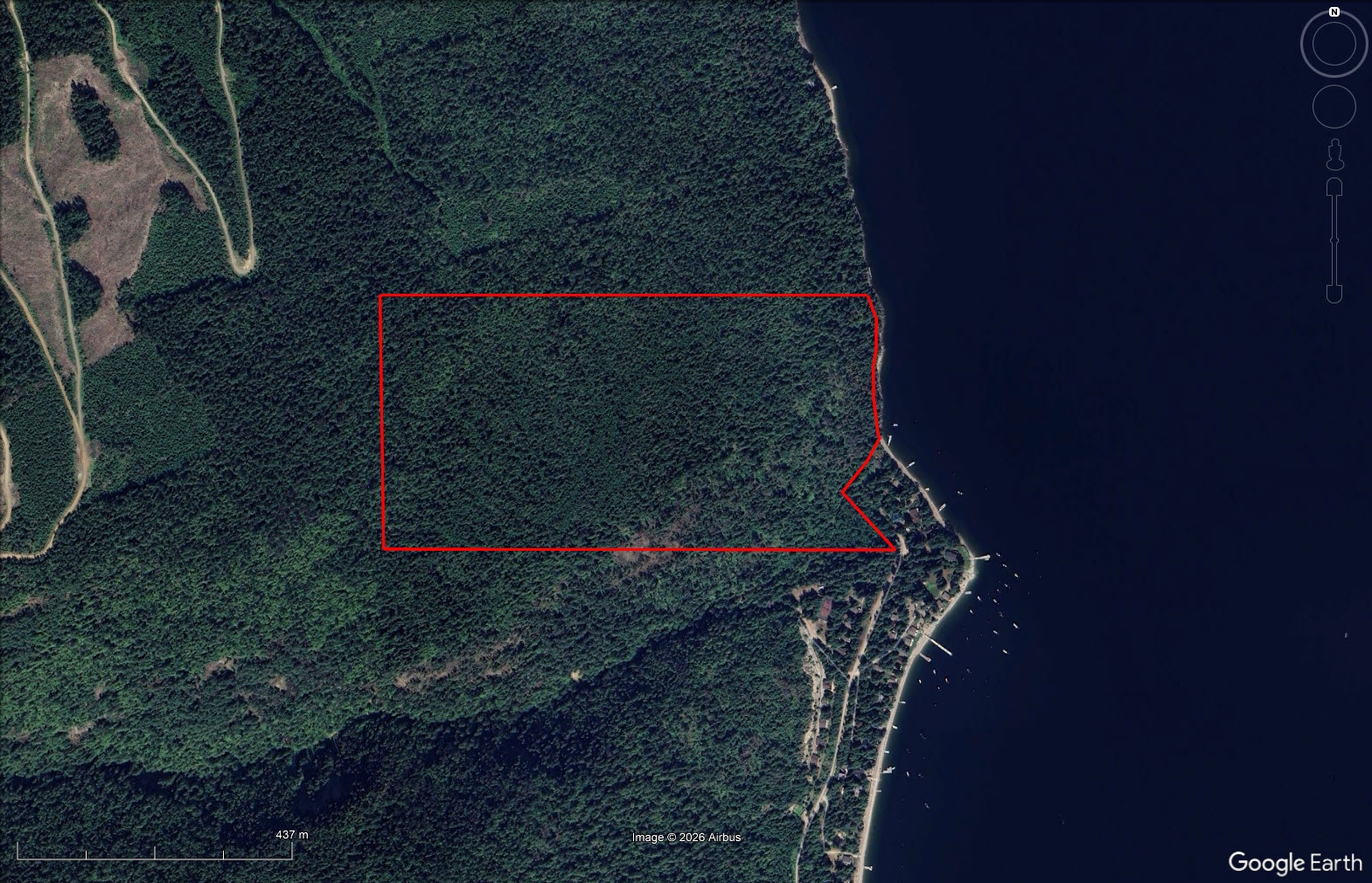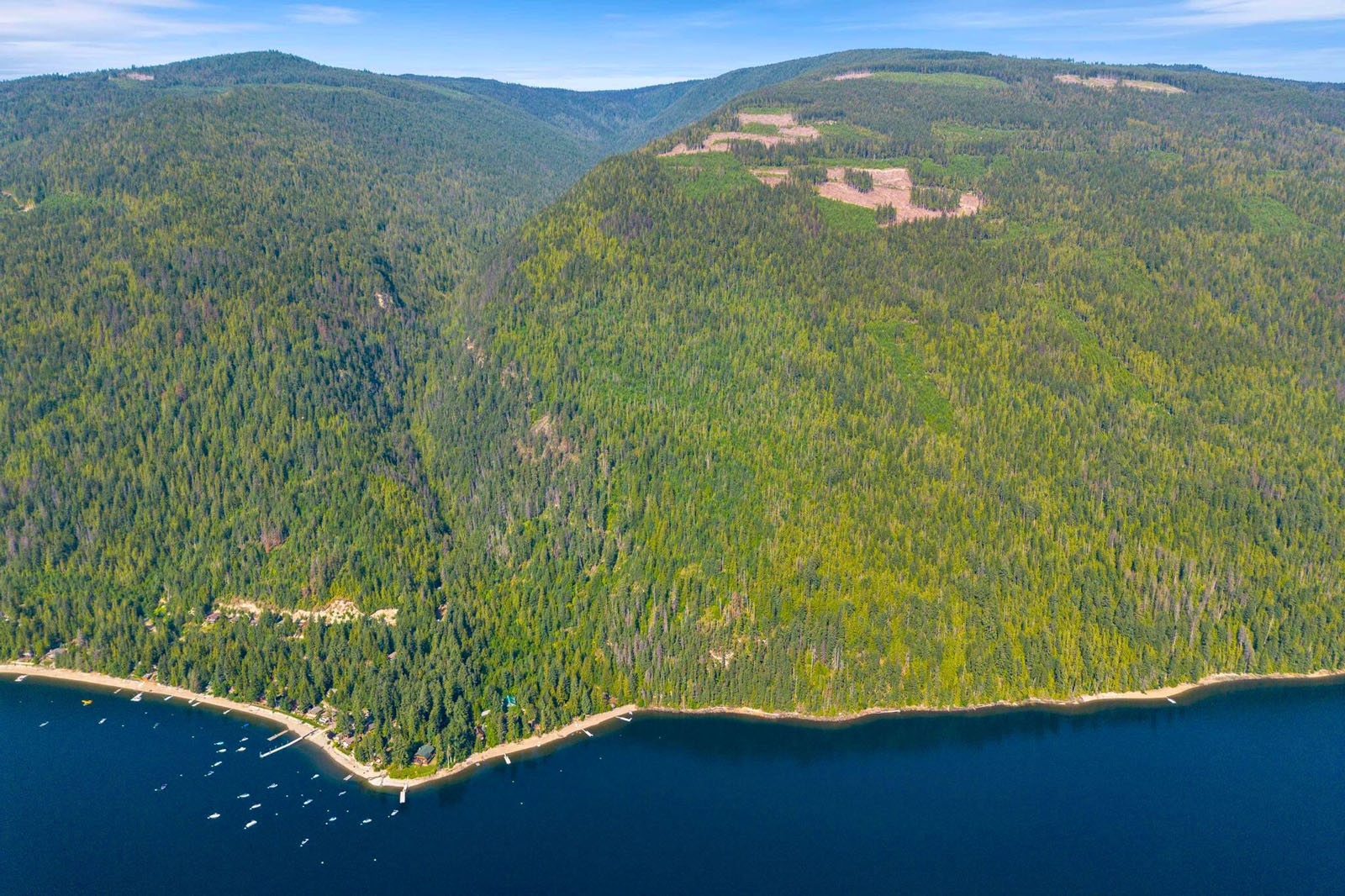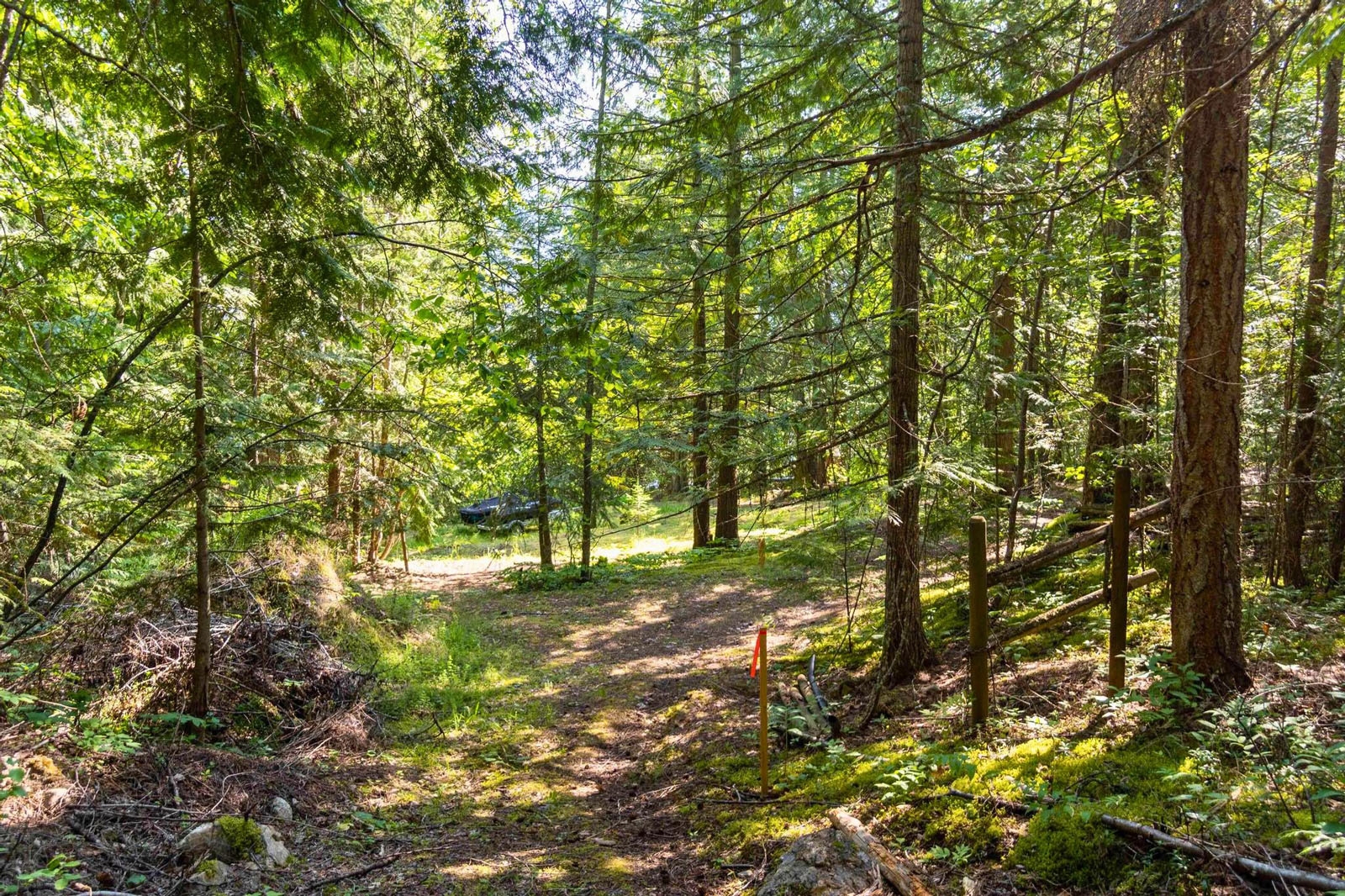 The balance of the acreage is largely forested and accessed by an old logging road and trail network, suitable for exploring, hiking, hunting, and general recreational use. Elevated areas across the property provide wide views directly across to Sicamous and north toward Anstey Arm, offering multiple outlooks across the lake and surrounding landscape.