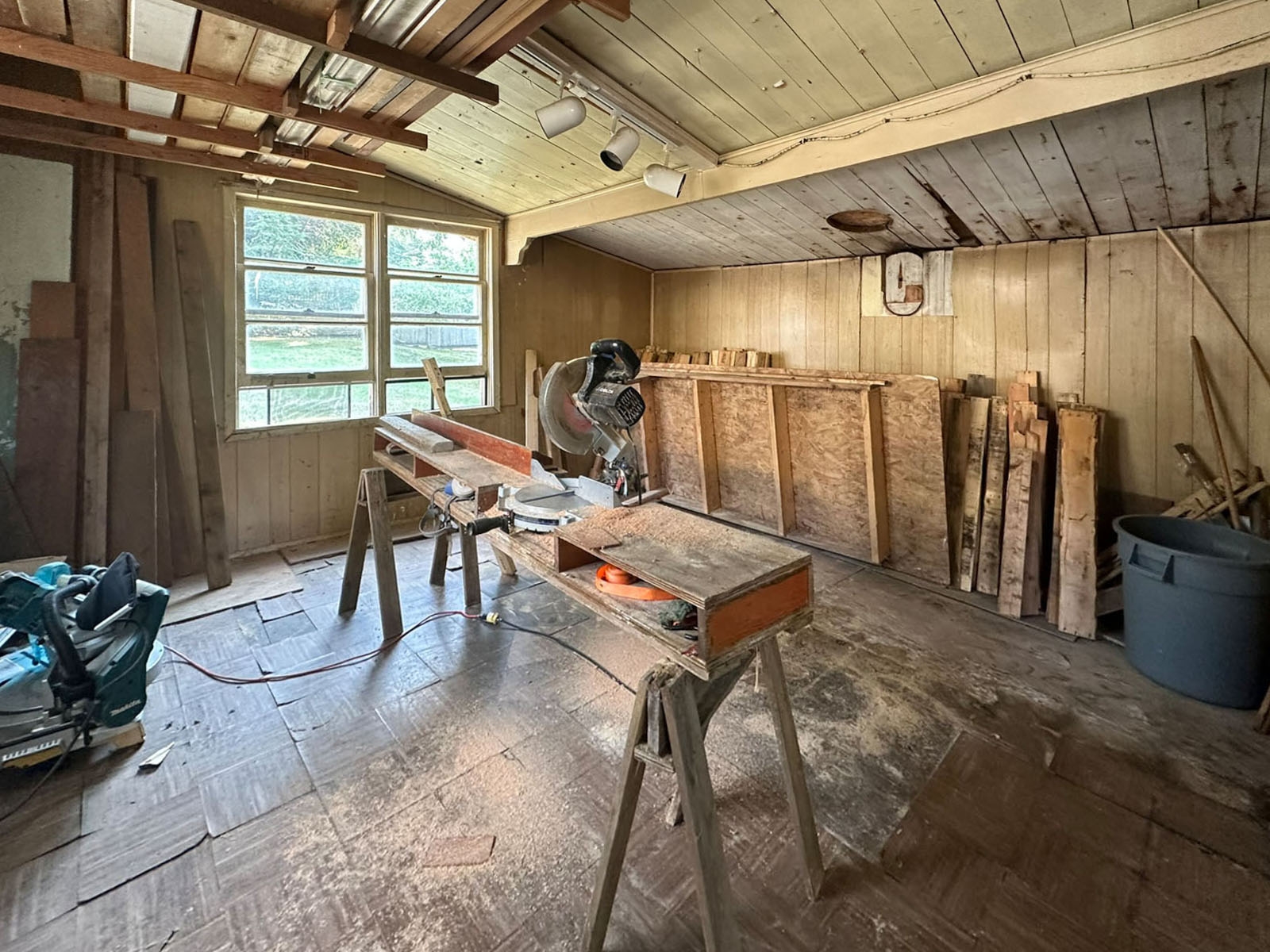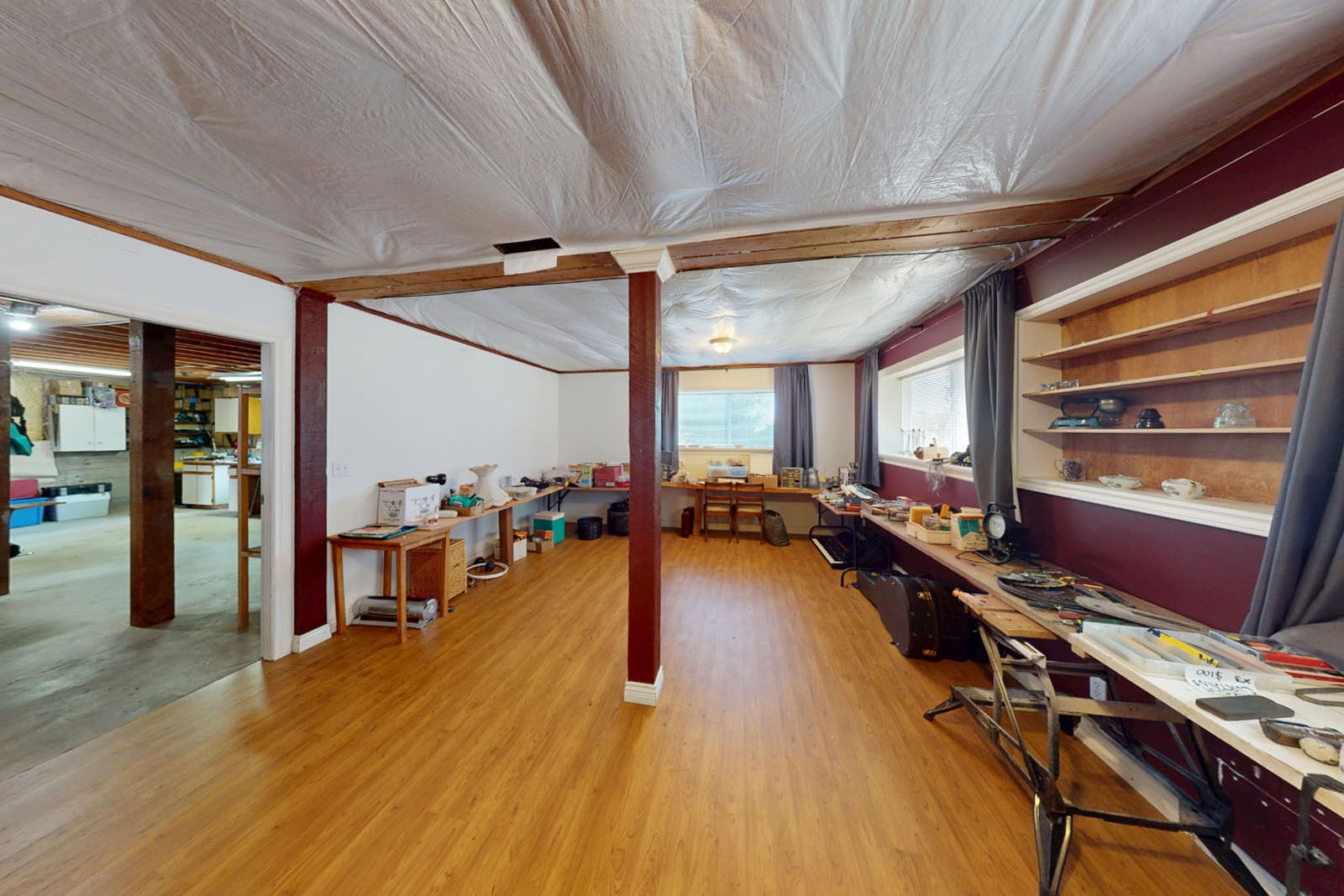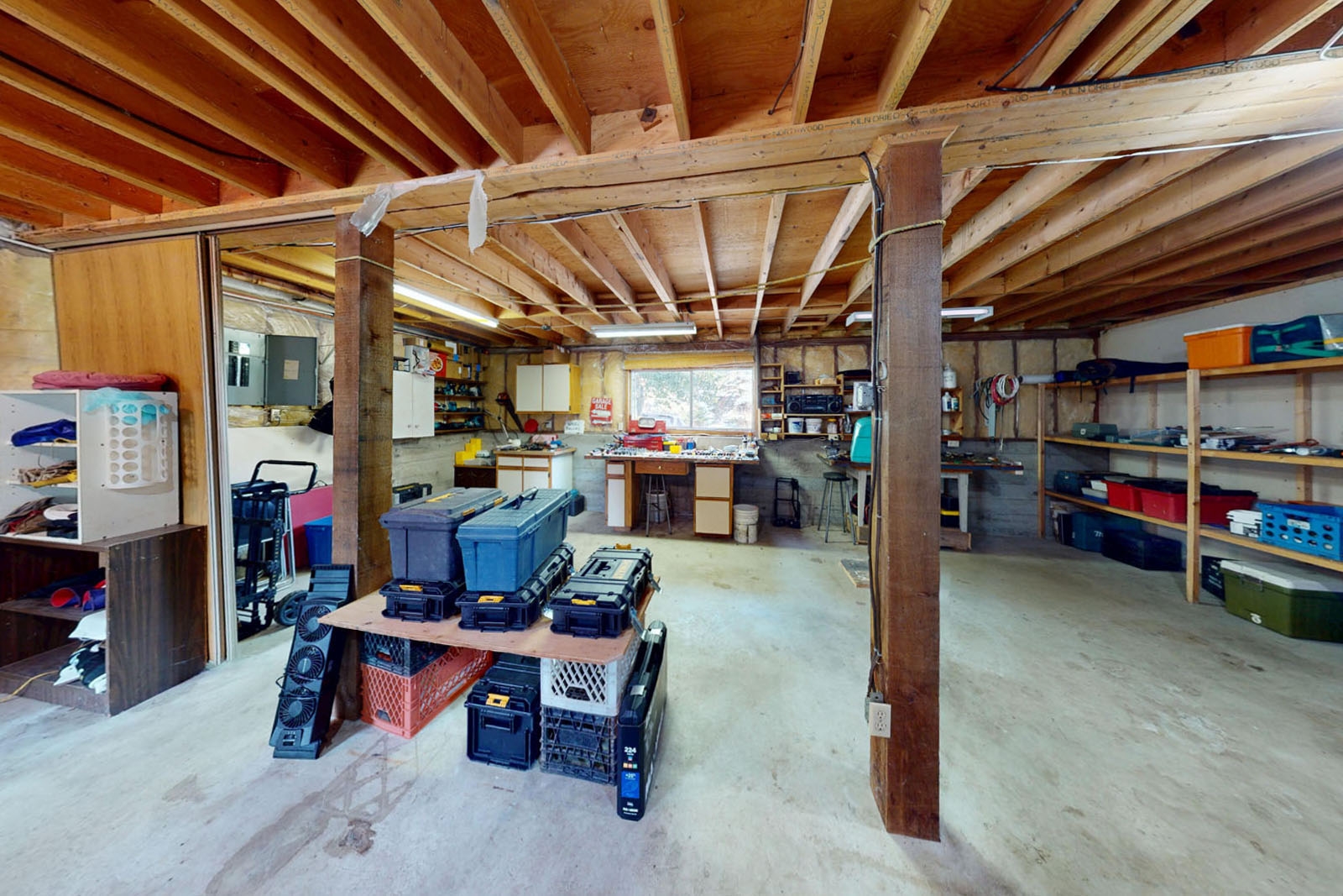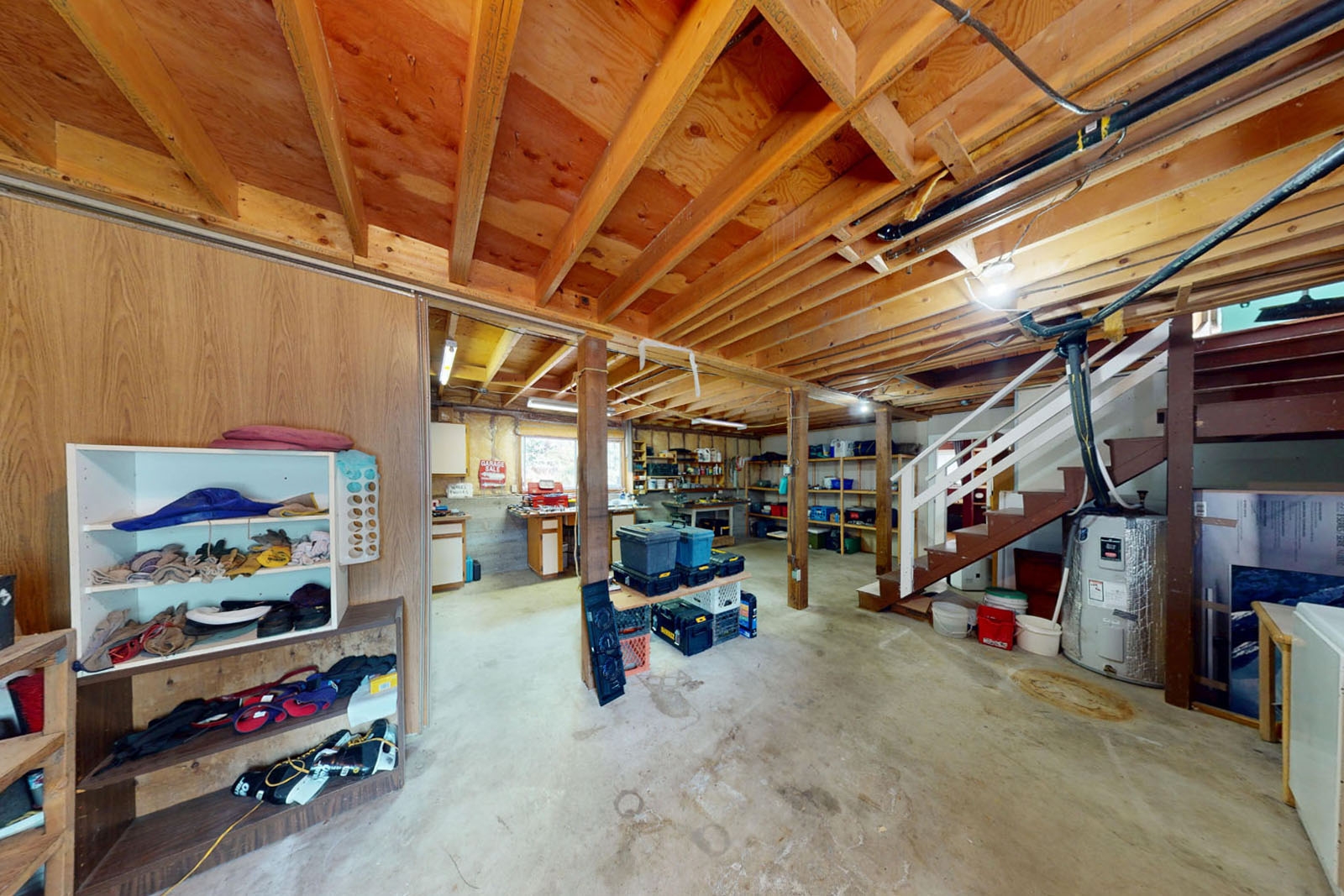 The home itself offers two bedrooms, two bathrooms, and over 2,100 sq. ft. of space including a walk-out basement currently used as workshop and storage. From the main level, large windows frame ocean and mountain views. The home is warm and welcoming, with wood accents and a classic Salt Spring feel.