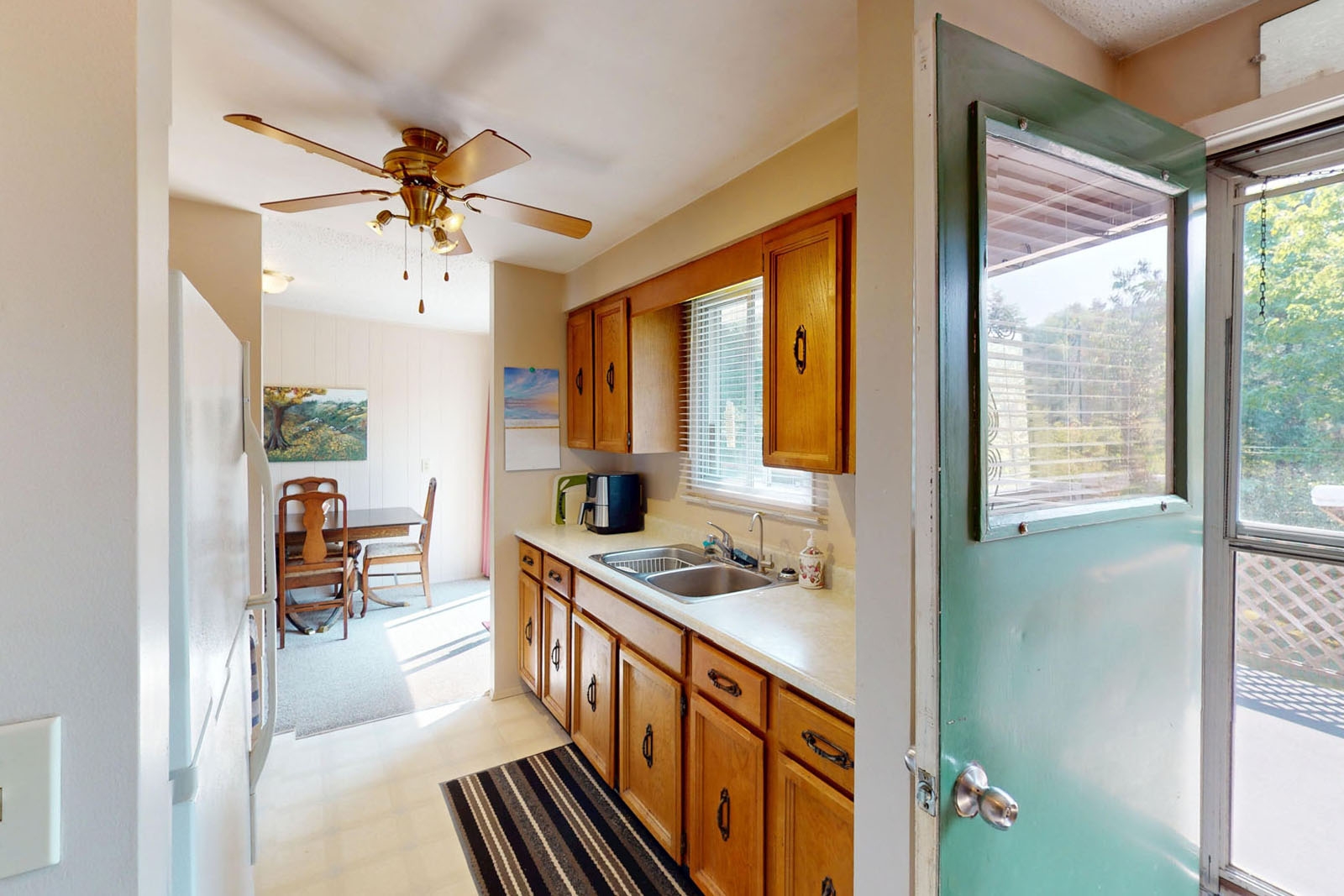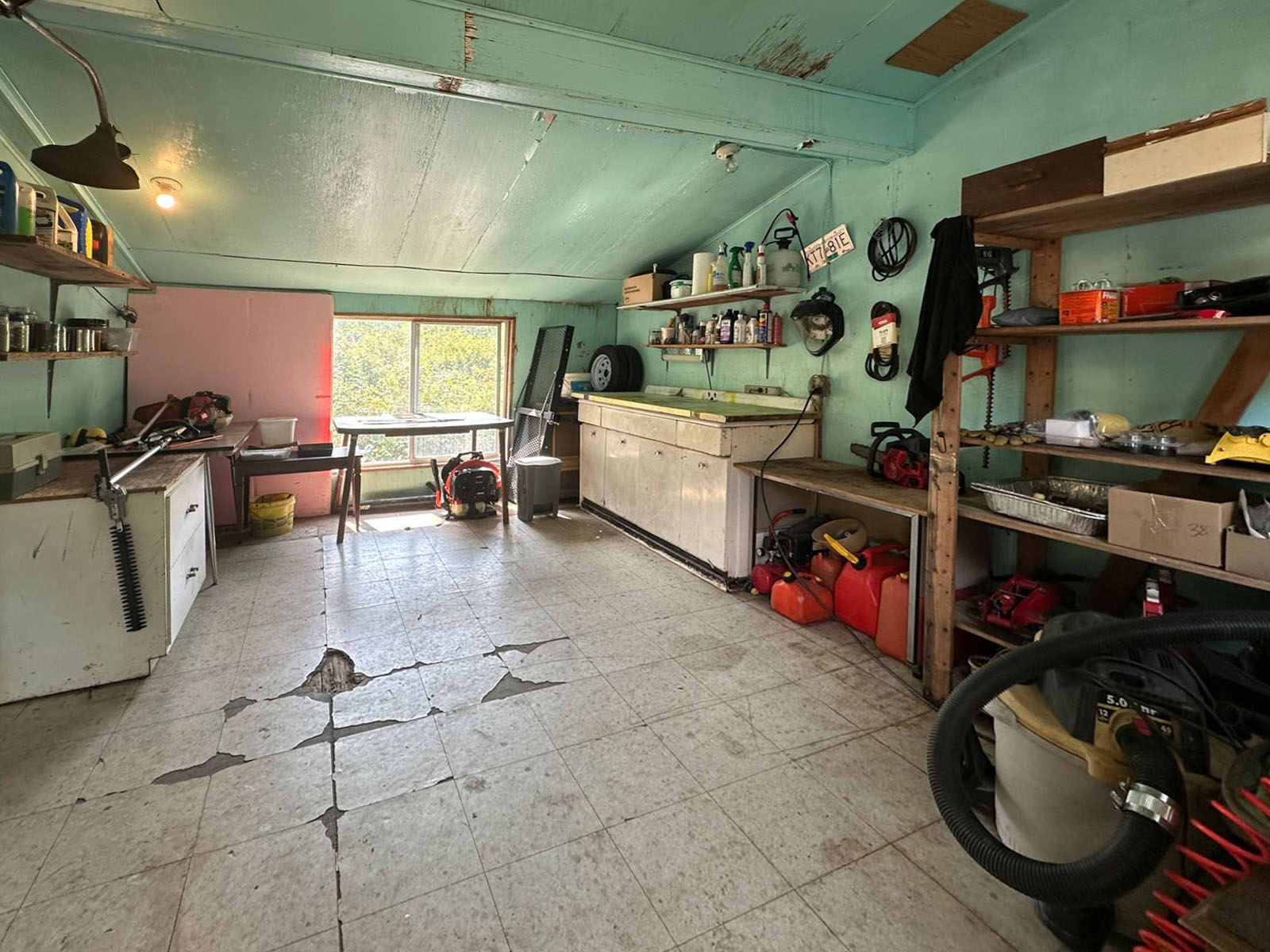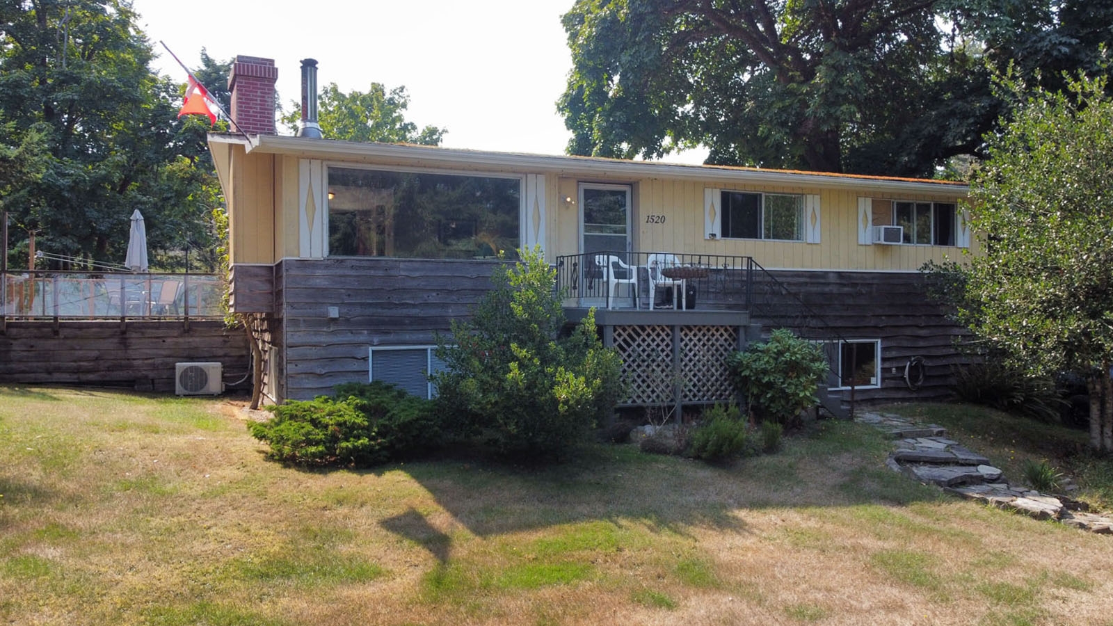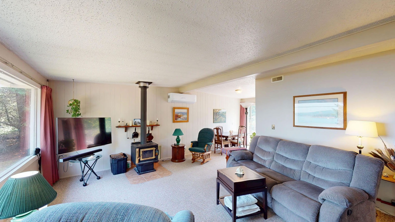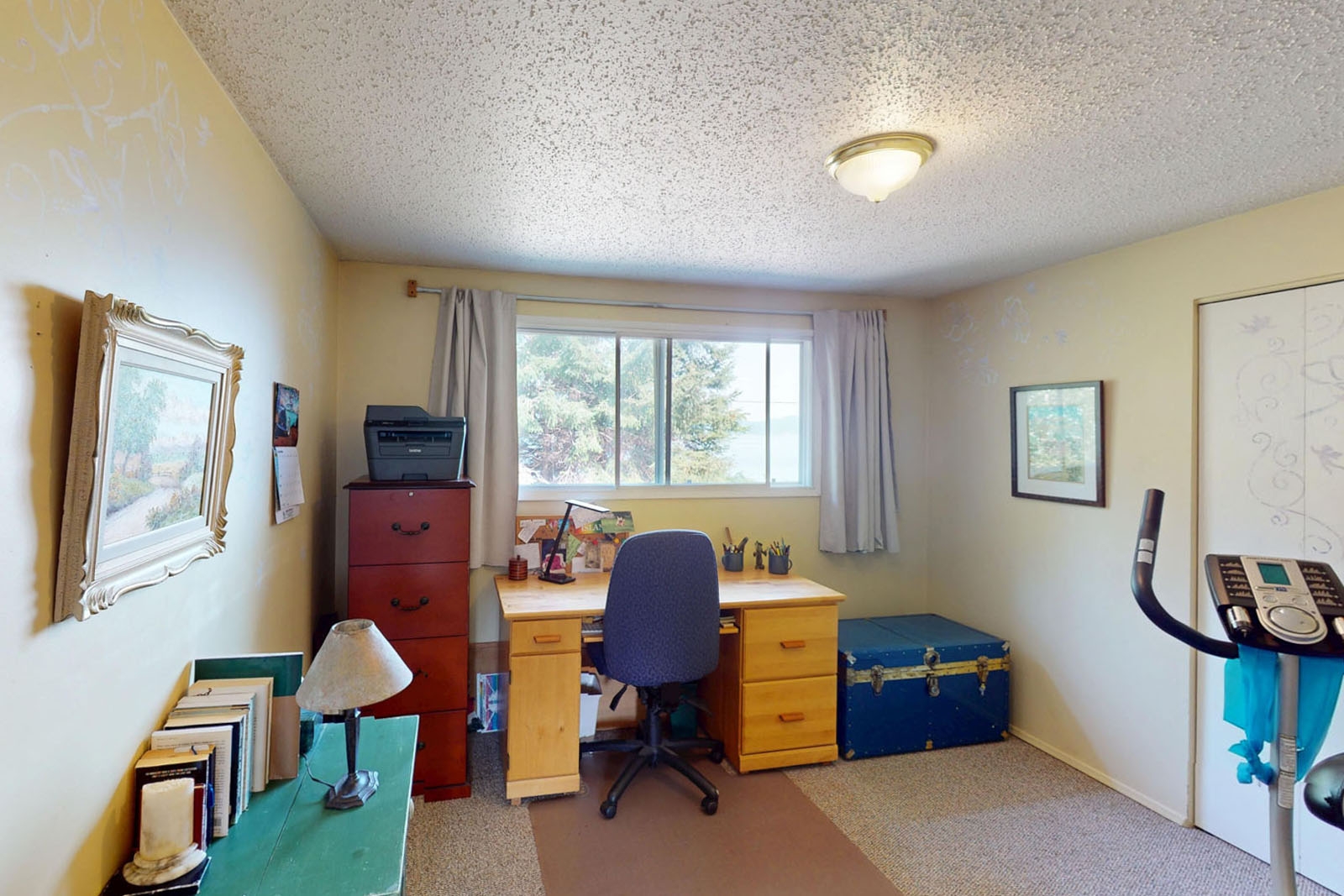 The home itself offers two bedrooms, two bathrooms, and over 2,100 sq. ft. of space including a walk-out basement currently used as workshop and storage. From the main level, large windows frame ocean and mountain views. The home is warm and welcoming, with wood accents and a classic Salt Spring feel.