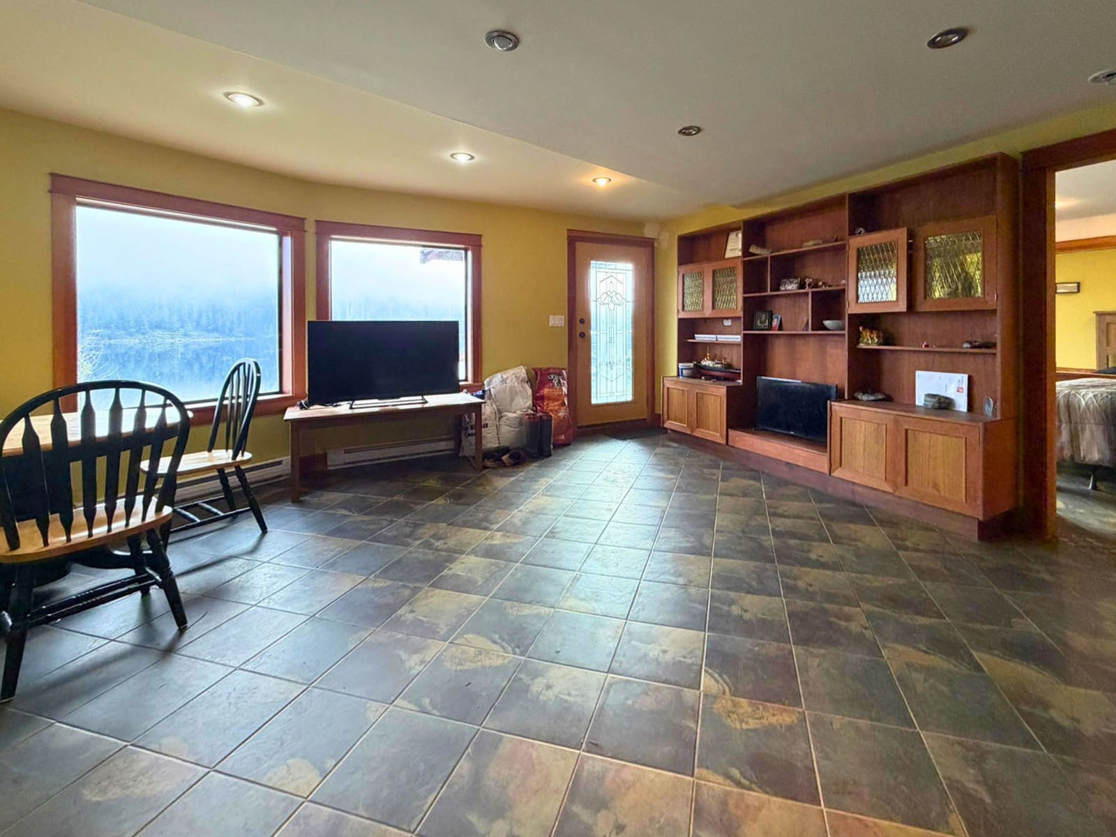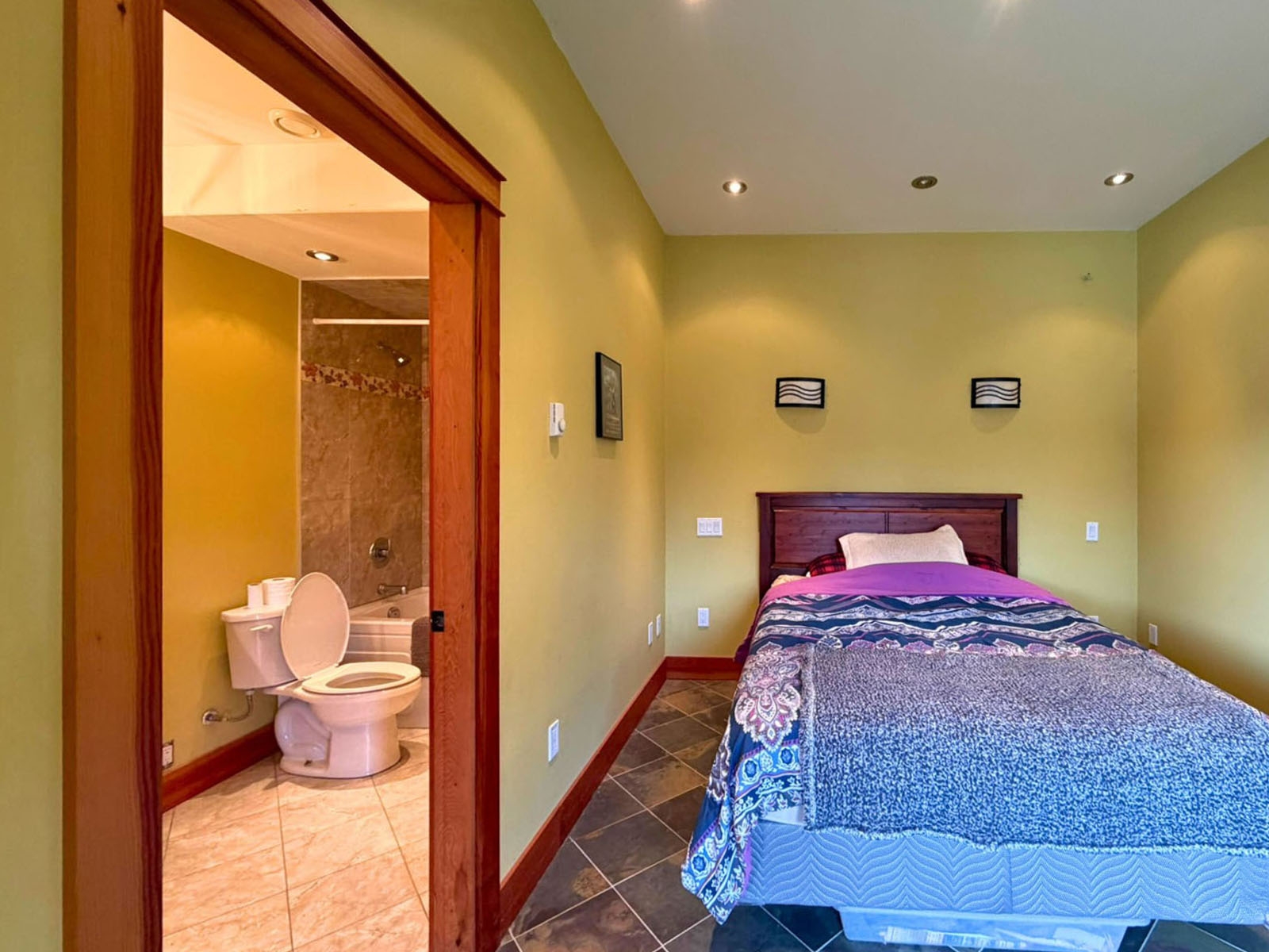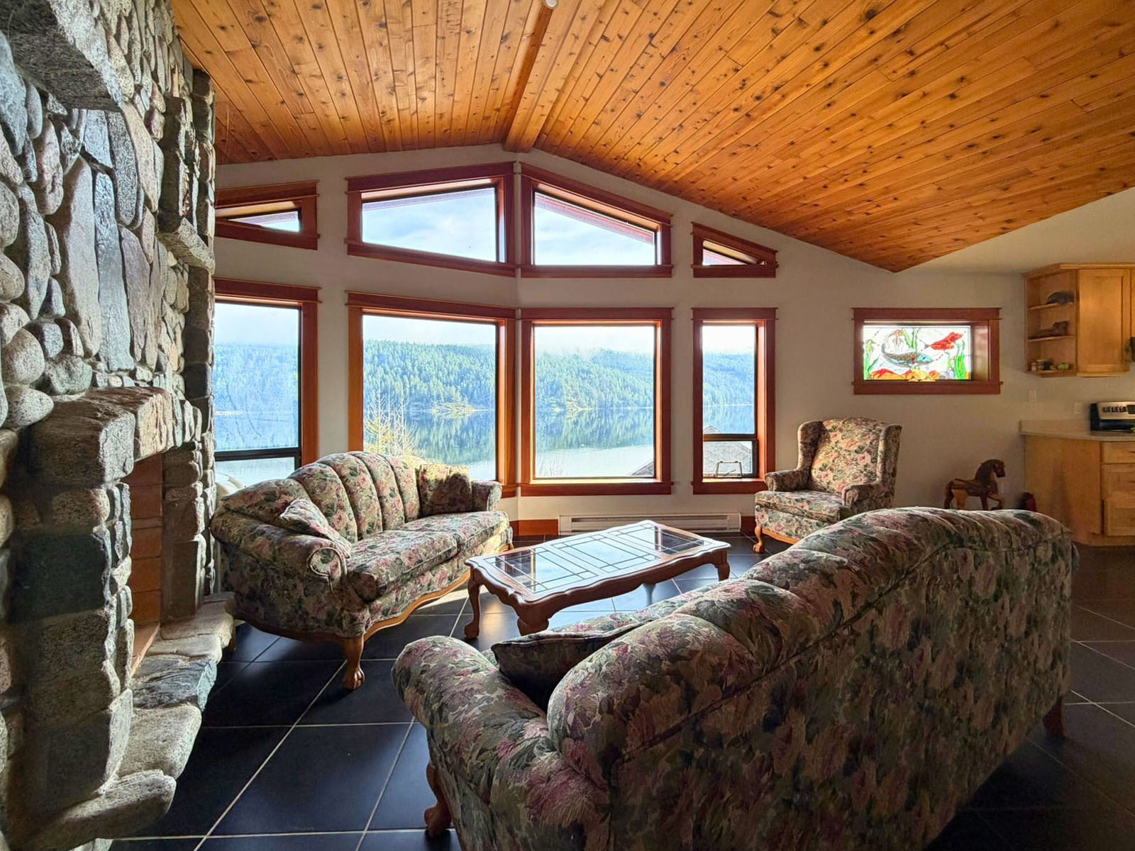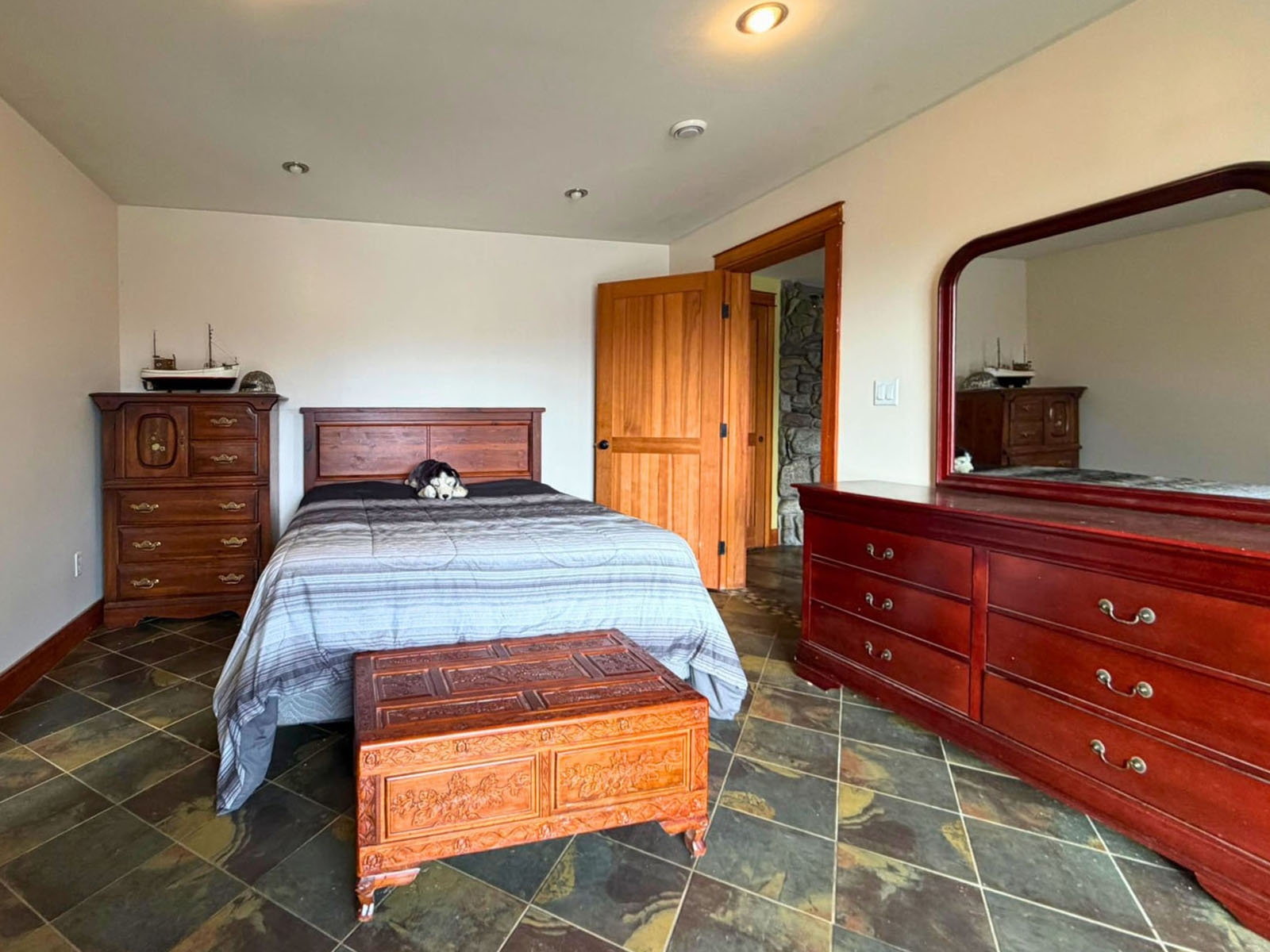The main residence provides flexible accommodation with five bedrooms and four bathrooms, including two bedrooms on the main floor. The living room features vaulted ceilings, a stone fireplace, and open views to the ocean and surrounding mountains. The primary bedroom is spacious and view-facing. The lower level includes two additional bedrooms and a bathroom, plus a separate-entry bedroom and bathroom, offering options for extended family, guests, or potential B&B use.