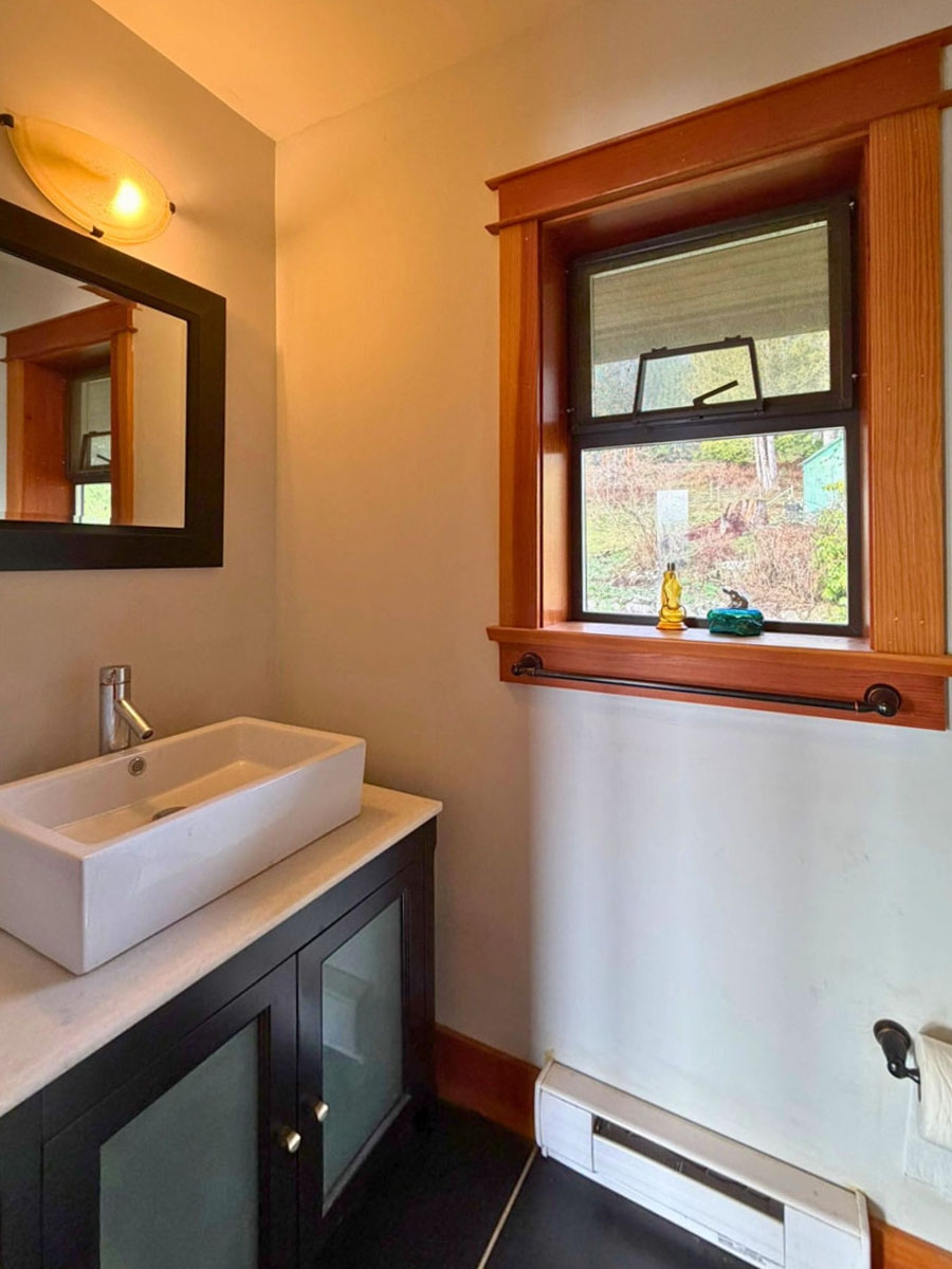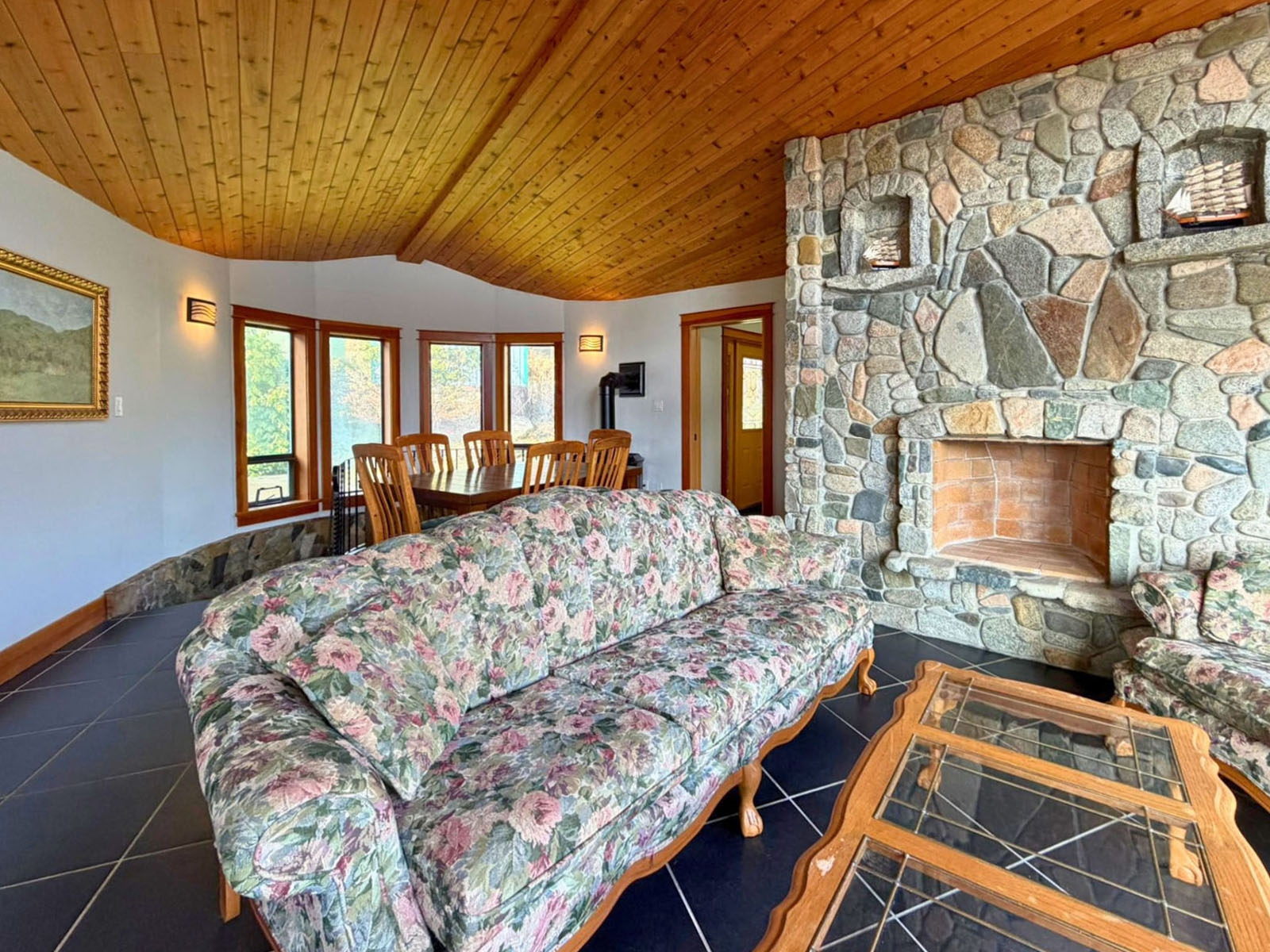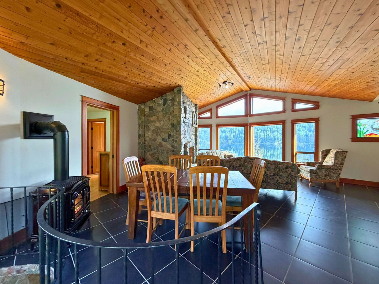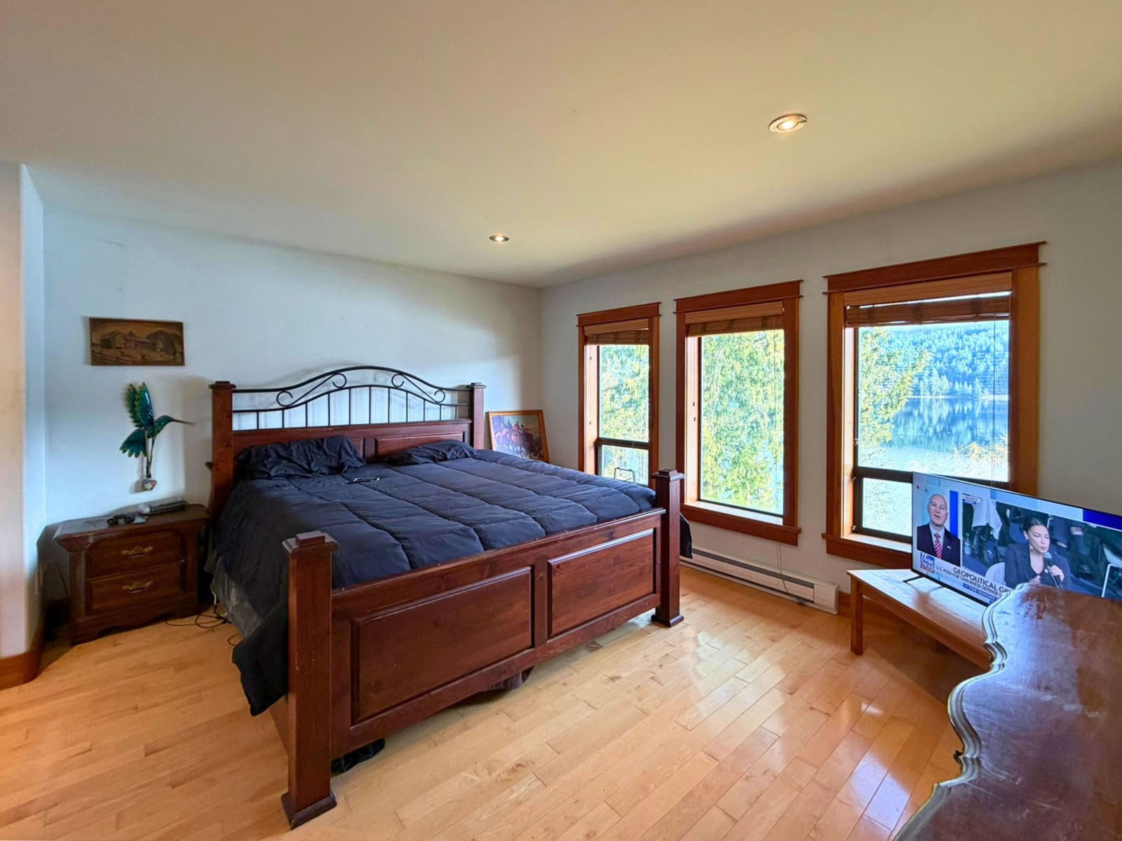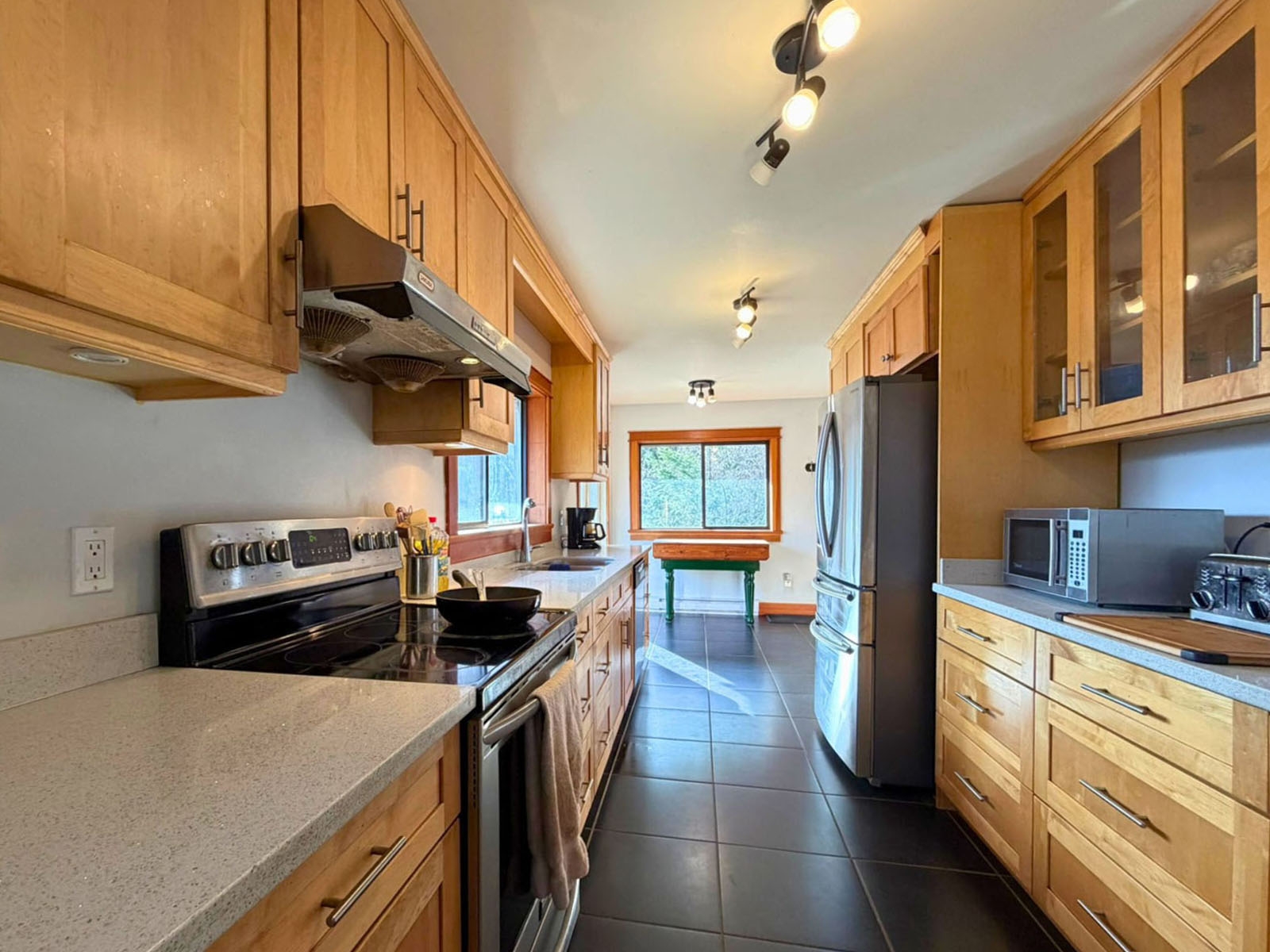 The main residence provides flexible accommodation with five bedrooms and four bathrooms, including two bedrooms on the main floor. The living room features vaulted ceilings, a stone fireplace, and open views to the ocean and surrounding mountains. The primary bedroom is spacious and view-facing. The lower level includes two additional bedrooms and a bathroom, plus a separate-entry bedroom and bathroom, offering options for extended family, guests, or potential B&B use.
