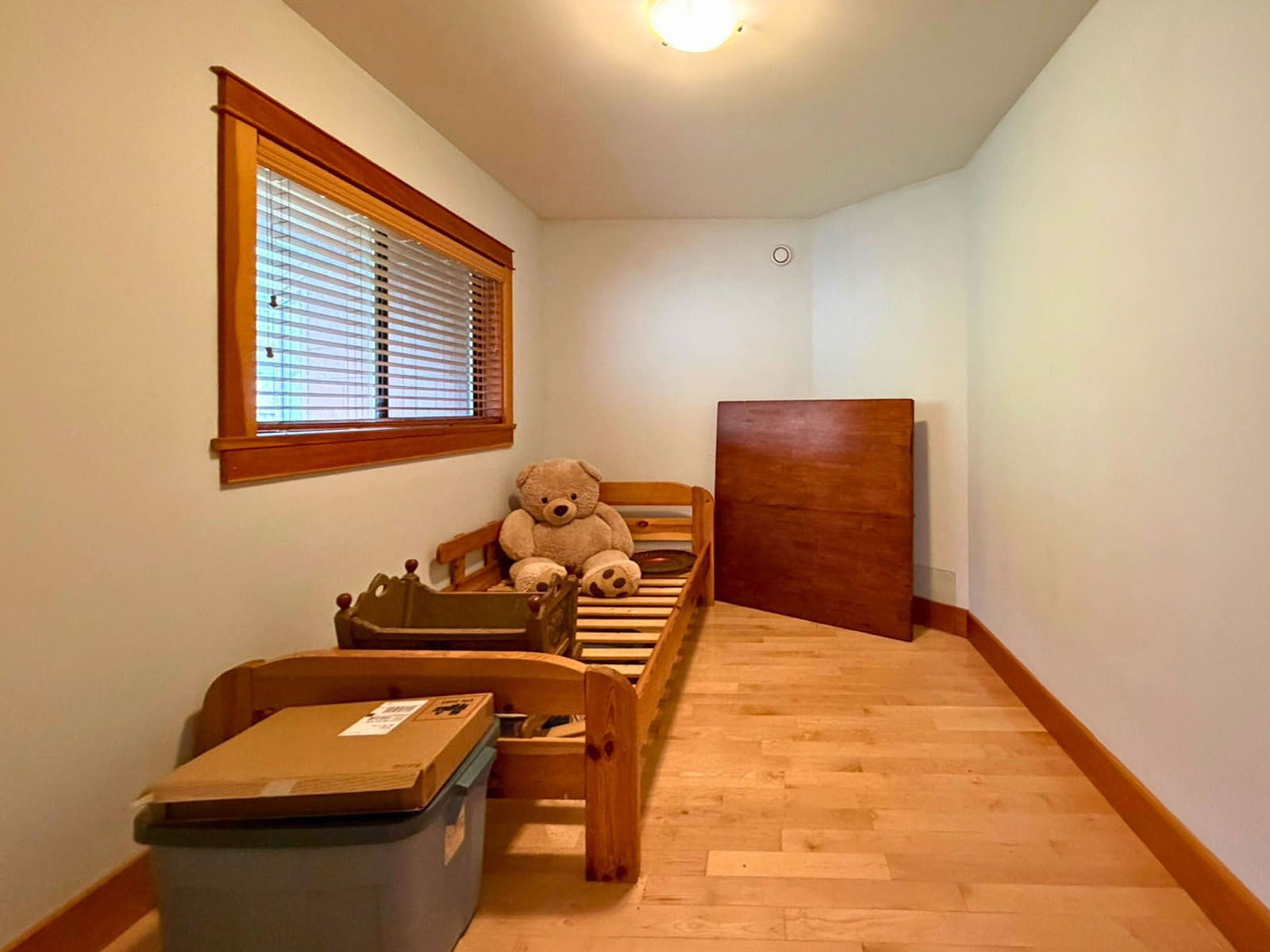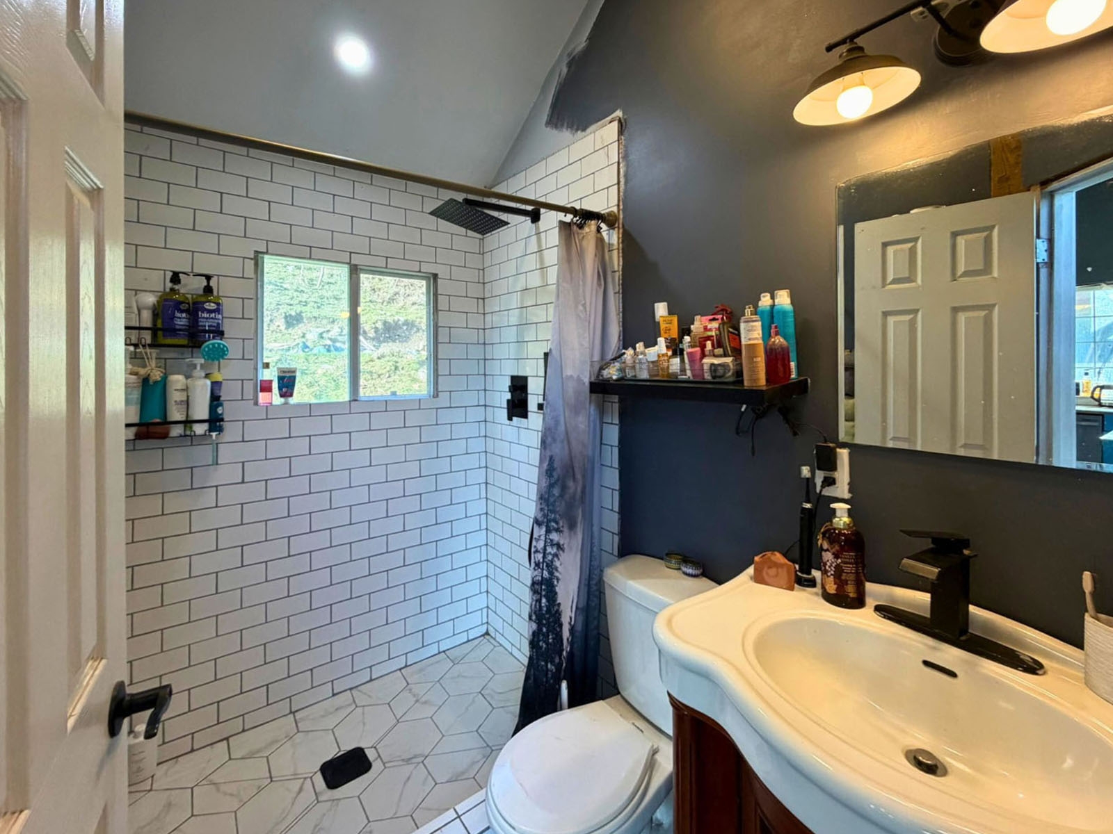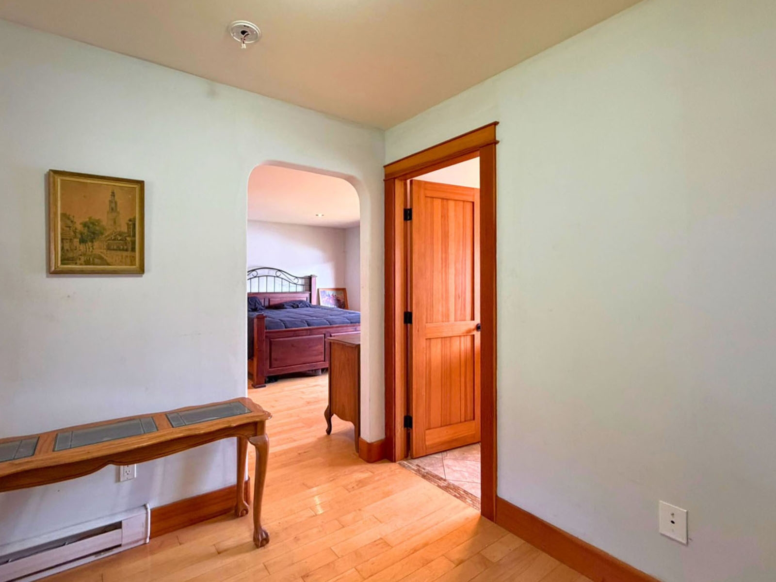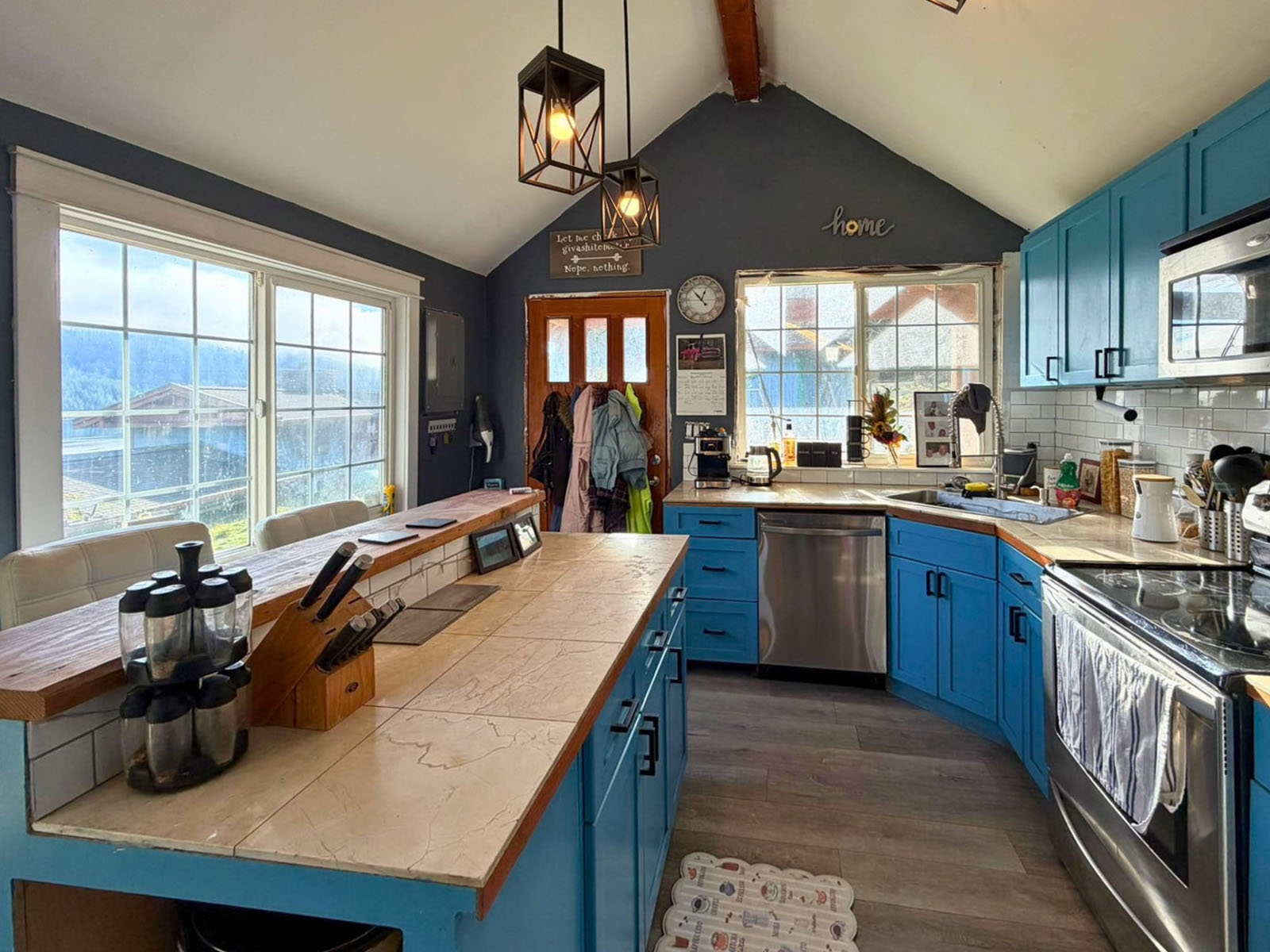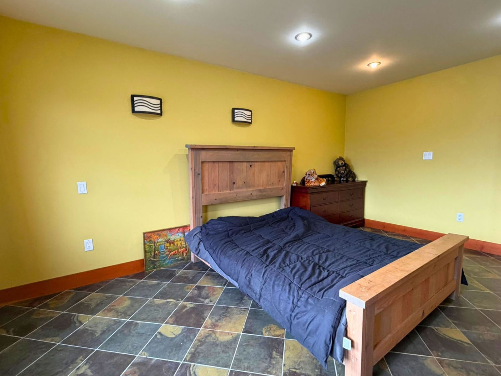 The main residence provides flexible accommodation with five bedrooms and four bathrooms, including two bedrooms on the main floor. The living room features vaulted ceilings, a stone fireplace, and open views to the ocean and surrounding mountains. The primary bedroom is spacious and view-facing. The lower level includes two additional bedrooms and a bathroom, plus a separate-entry bedroom and bathroom, offering options for extended family, guests, or potential B&B use.