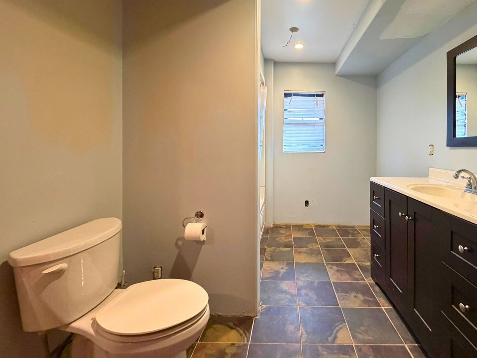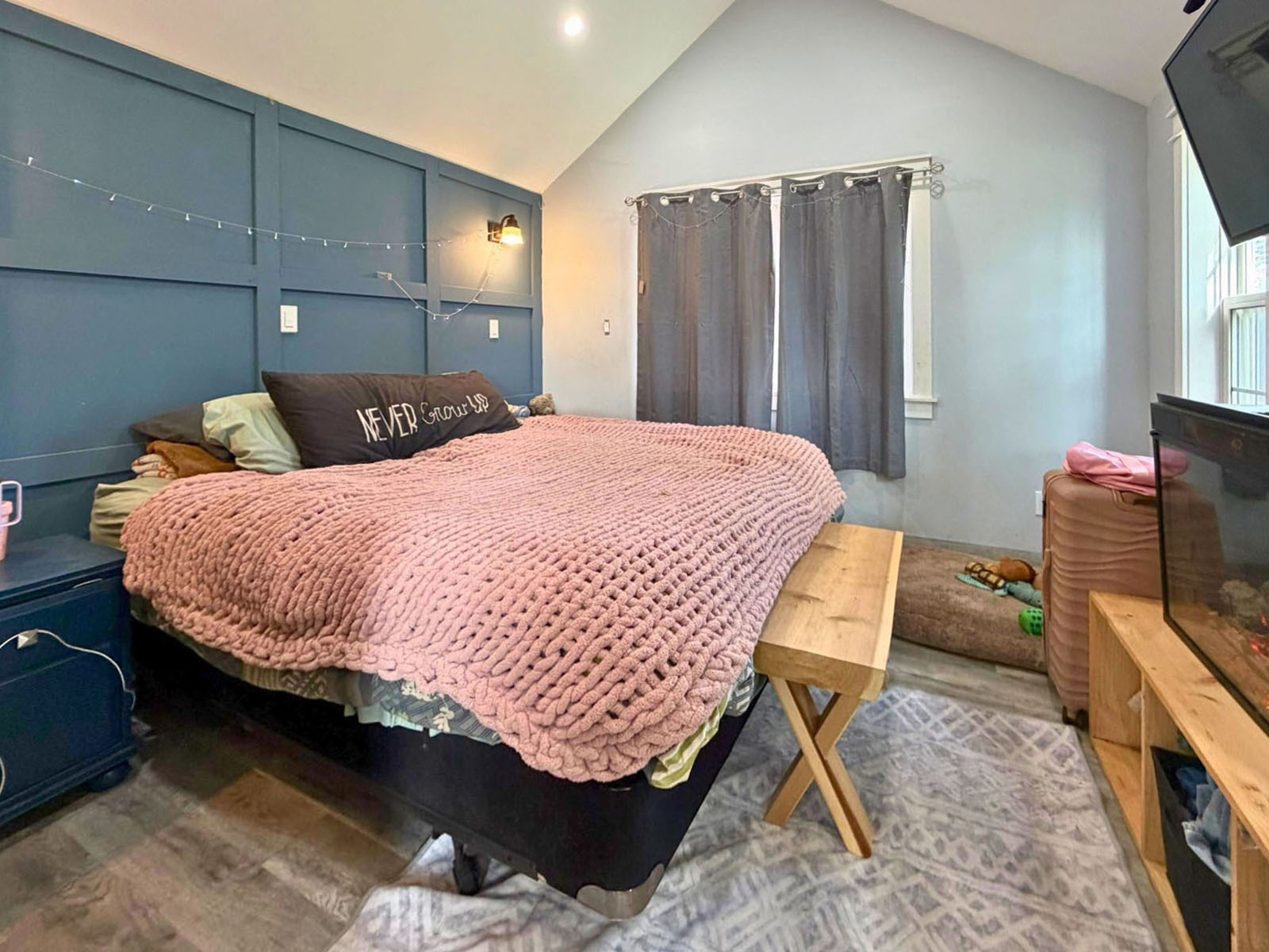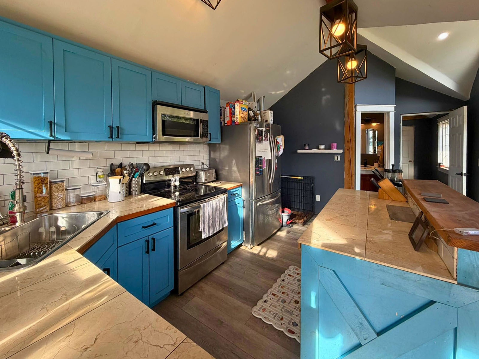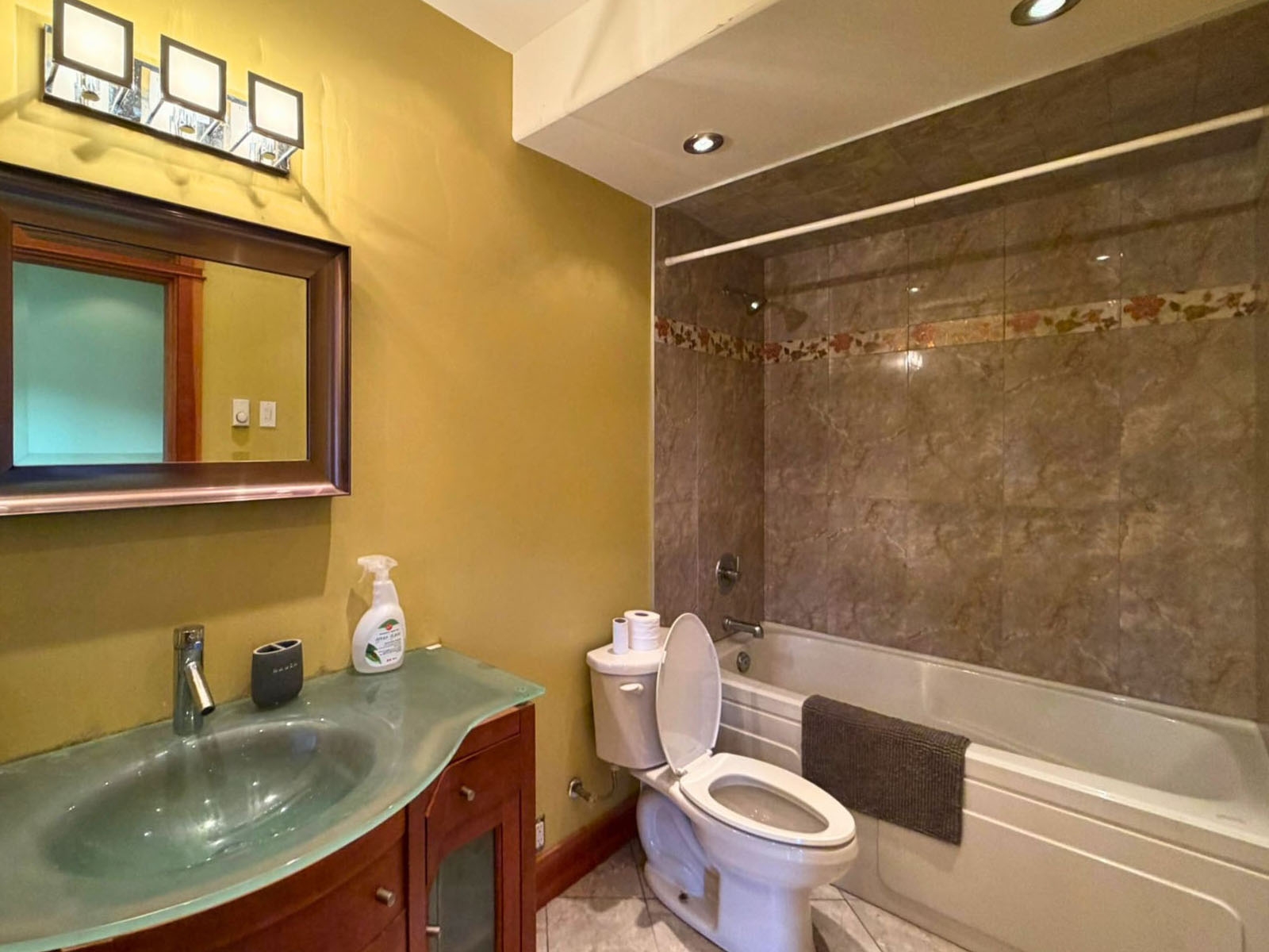 The main residence provides flexible accommodation with five bedrooms and four bathrooms, including two bedrooms on the main floor. The living room features vaulted ceilings, a stone fireplace, and open views to the ocean and surrounding mountains. The primary bedroom is spacious and view-facing. The lower level includes two additional bedrooms and a bathroom, plus a separate-entry bedroom and bathroom, offering options for extended family, guests, or potential B&B use.