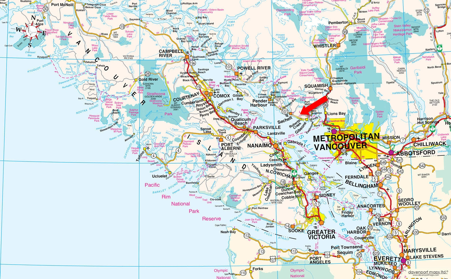 Roberts Creek is also the location for several important regional amenities including Dakota Ridge, a winter recreation area offering 12 km of groomed snowshoe and cross-country ski trails, the “Sechelt” landfill, the Sunshine Coast Regional District’s water intake and the Seaview Cemetery.