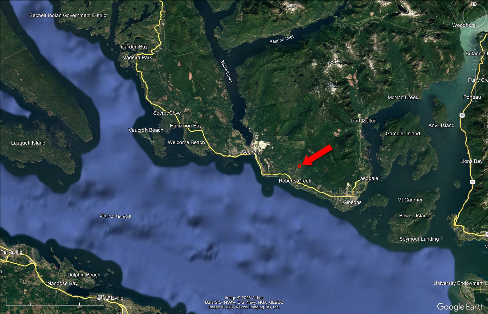 Roberts Creek (xwesam/Stelḵáya) is a small residential community of about 3,553 people located between Gibsons and Sechelt on the southern Sunshine Coast in British Columbia. It is a short drive from both Gibsons and Sechelt, making it a quick trip for anyone visiting the Sunshine Coast or a convenient day trip from Vancouver.